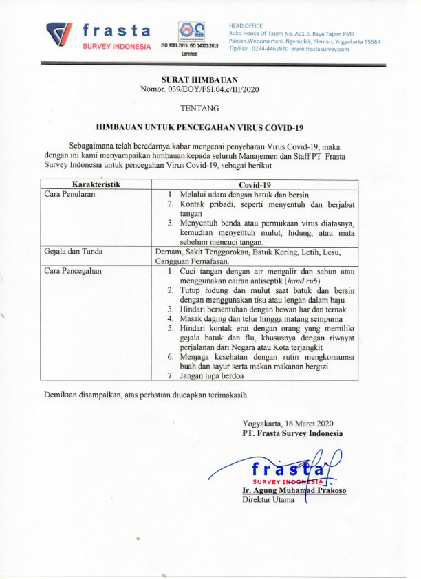 Sehubungan dengan kondisi pandemi Virus Covid-19 saat ini, maka kami segenap keluarga besar dan manajemen dari PT Frasta Survey Indonesia serta sister company PT Frasta Era Teknologi Cemerlang menyampaikan himbauan kepada seluruh staff karyawan untuk pencegahan Virus Covid-19, sebagai berikut :